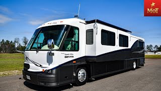 STOCK # C3454 2000 Grand Villa U320 4010 CAI. The Living Room Slide Provides Plenty Of Space Forward. This Floor Plan is In Much Demand By Full-Timers As Well As Weekenders. Big Cummins 450 HP And Allison 6 Speed With Retarder Is Both Powerful And Efficient. This Is The 40' "Sloping Front" Version With A Single Rear Axle Which Provides For Larger Storage Bays Outside And The Entry Door Located Under The Awning With Entry To The Galley Area Instead Of Through The Living Room.